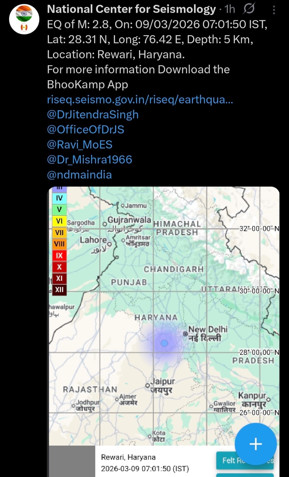 नेशनल सेंटर ऑफ सिसमोलॉजी (NCS) के अनुसार इस भूकंप का केंद्र हरियाणा के रेवाड़ी जिले में था। रिक्टर स्केल पर इसकी तीव्रता 2.8 मापी गई है। वैज्ञानिकों के मुताबिक यह हल्की तीव्रता का भूकंप था, इसलिए इसका असर सीमित क्षेत्रों तक ही महसूस हुआ।