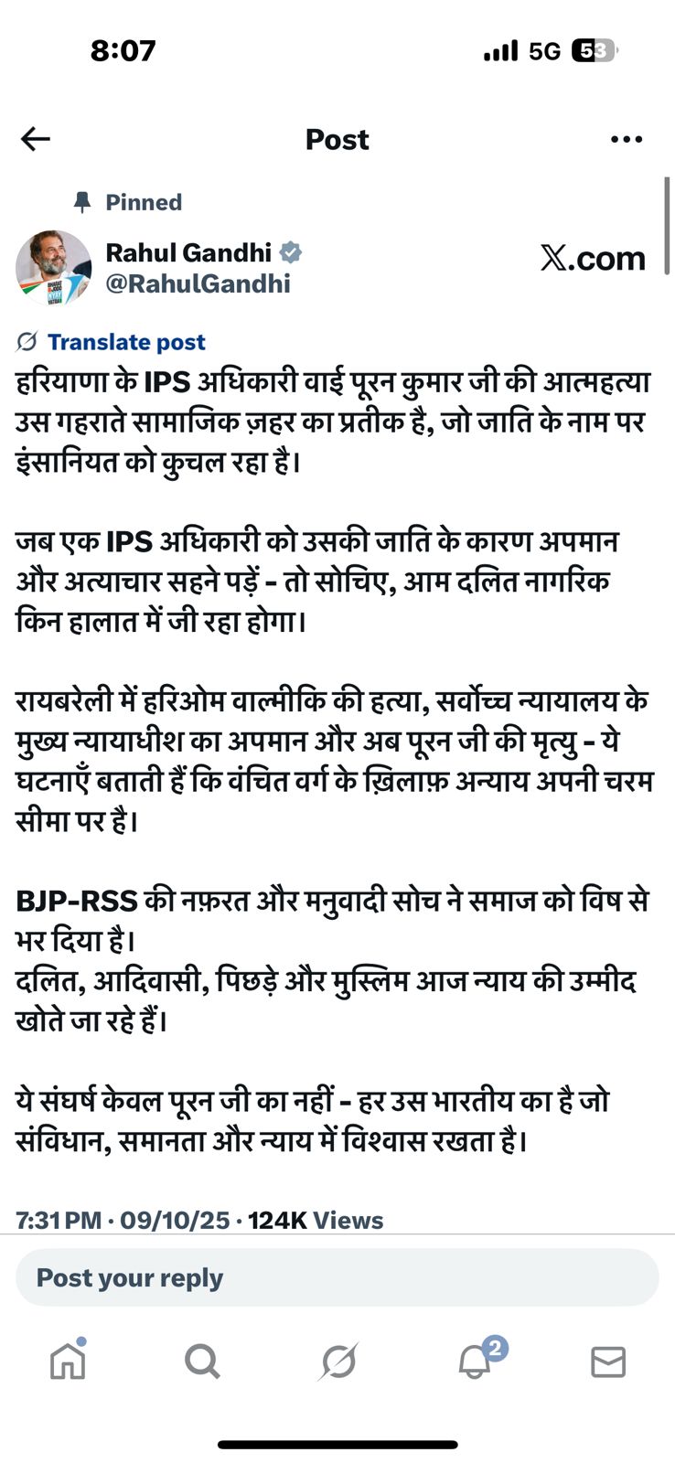 राहुल गांधी ने सोशल मीडिया प्लेटफॉर्म एक्स (X) पर पोस्ट करते हुए लिखा, “BJP-RSS की नफरत और मनुवादी सोच ने समाज में विष भर दिया है। दलित, आदिवासी, पिछड़े और मुस्लिम समाज न्याय की उम्मीद खो चुके हैं।”