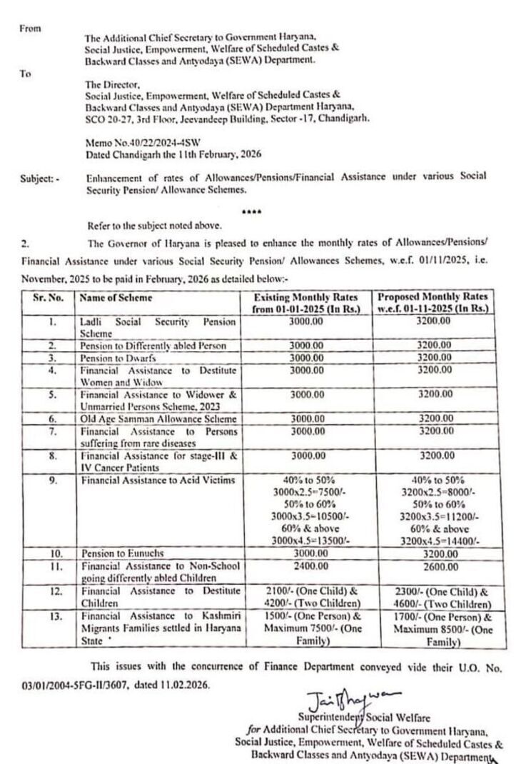 हरियाणा सरकार ने बजट सत्र से ठीक पहले प्रदेश के लाखों जरूरतमंद परिवारों को बड़ी राहत दी है। मुख्यमंत्री नायब सैनी के निर्देश पर 13 श्रेणियों की सामाजिक सुरक्षा पेंशनों में ₹200 प्रतिमाह की बढ़ोतरी कर दी गई है। इस फैसले के बाद अब प्रदेश के करीब 30 लाख पेंशनरों को ₹3200 से लेकर ₹14400 तक की मासिक पेंशन मिलेगी। सोशल वेलफेयर डिपार्टमेंट ने इसका आधिकारिक नोटिफिकेशन जारी कर दिया है और अधिकारियों को दो दिनों के भीतर बढ़ी हुई राशि जारी करने के निर्देश दिए गए हैं।