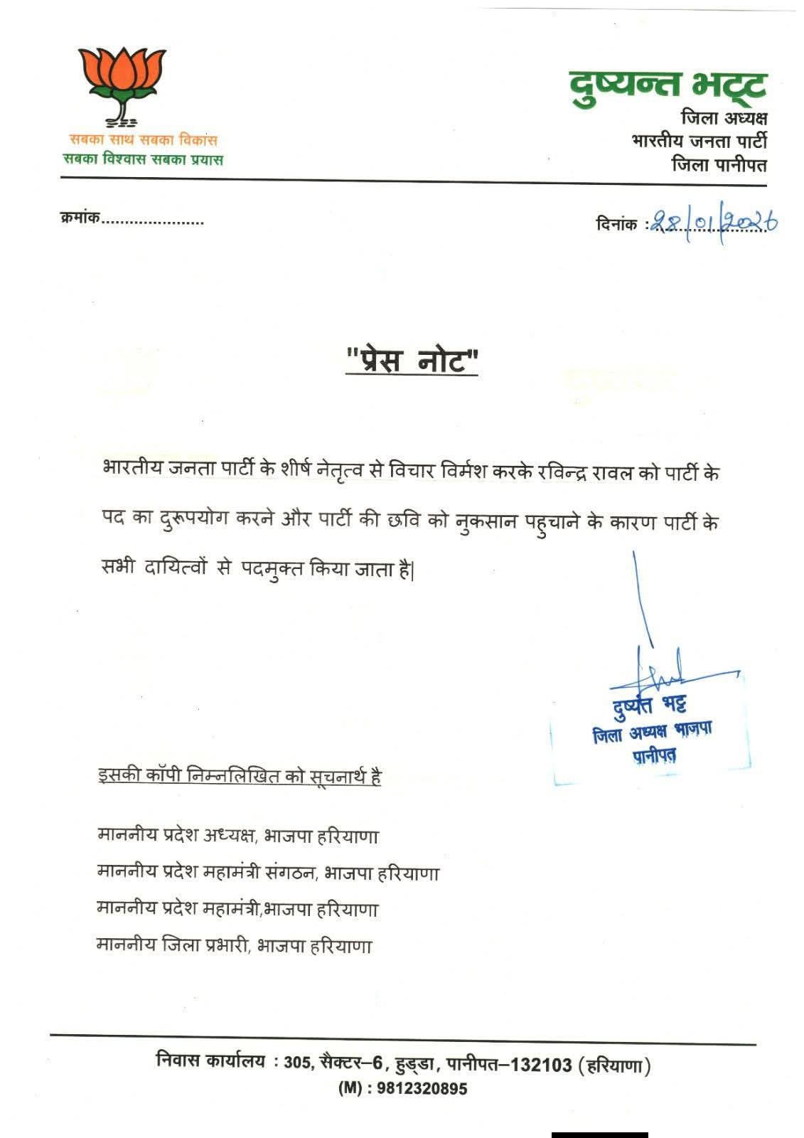 भारतीय जनता पार्टी ने अनुशासनहीनता और भ्रष्टाचार के खिलाफ जीरो टॉलरेंस नीति अपनाते हुए पानीपत के जिला सचिव रविंद्र रावल को उनके पद से तत्काल प्रभाव से बर्खास्त कर दिया है। यह कार्रवाई रिश्वत लेते हुए वीडियो वायरल होने के बाद की गई है, जिसने सियासी गलियारों में हड़कंप मचा दिया।